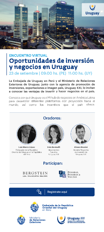 La Embajada de Uruguay en Perú y el Ministerio de Relaciones Exteriores de Uruguay, junto con la agencia de promoción de inversiones, exportaciones e imagen país, Uruguay XXI, lo invitan a conocer las ventajas de invertir y hacer negocios en el país.
